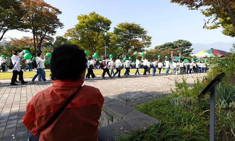 ▲12일 서울대공원에서 신천지 과천‧왕십리교회가 ‘신천지 전도 대성회’ 홍보 행진을 펼치는 가운데, 시민이 행진을 바라보고 있다.  [사진 제공 = 신천지 과천교회]