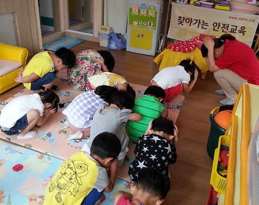 | △ 지진 발생시 행동요령을 익히는 어린이들 |