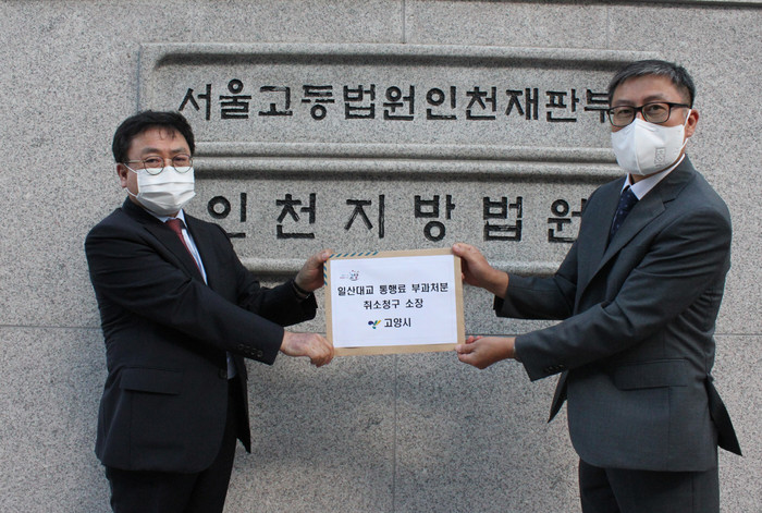 [사진 설명] 허신용 고양시 비서실장(왼쪽)이 9월 23일 오후 인천지방법원에 ‘일산대교 통행료 부과처분 취소 청구 소장’을 접수했다.