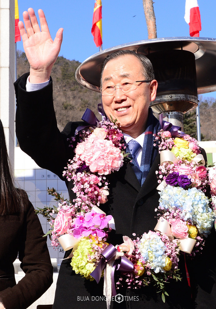 반기문 전 유엔 사무총장이 14일 오전 충북 음성 반기문 평화랜드에서 열린 환영행사에서 꽃목걸이를 걸고 손을 흔들고 있다. 2017.01.14.