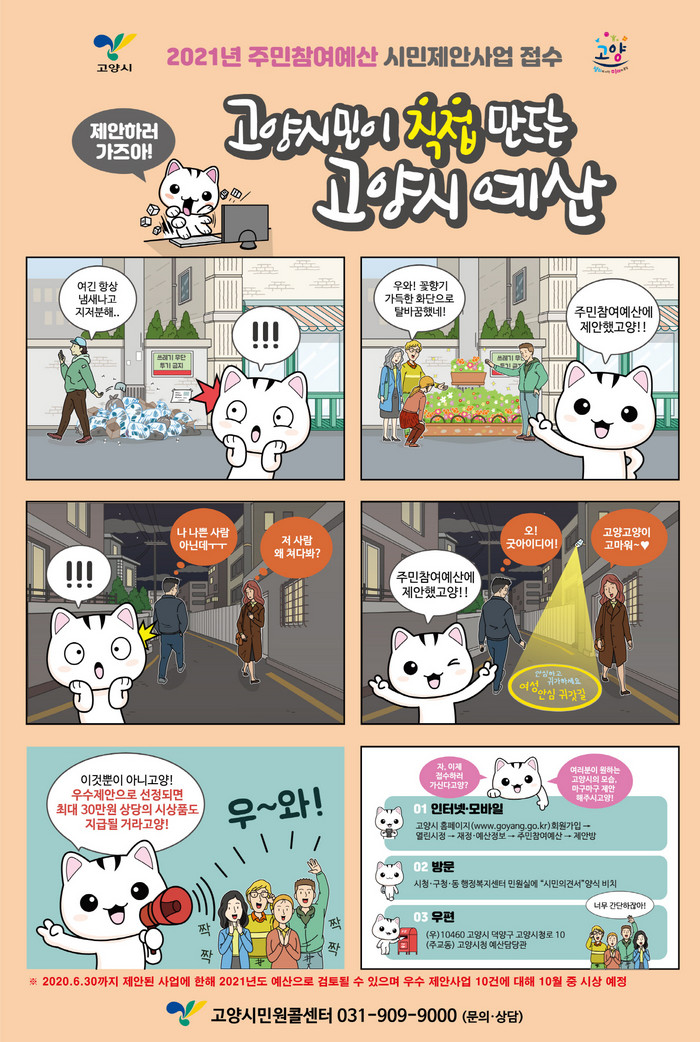이에 따라 시의 대표 마스코트인 '고양고양이'를 활용, 주민참여예산 실제 적용사례를 다룬 웹툰형 홍보물을 제작해 관공서 및 지하철역사, 은행 등 다중이용시설에 배포하고, 모바일에서도 실질적인 제안서 작성이 가능하도록 홈페이지 플랫폼을 정비하는가 하면 우수 제안사업에 대해 시상금을 도입하는 등 제도 전반에 걸쳐 시민들을 맞아들일 만반의 준비를 마쳤다.