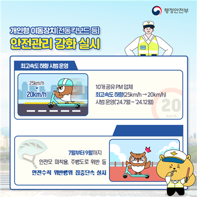 먼저, 개인형 이동장치 사고 예방을 위해 현행법상 시속 25km인 개인형 이동장치 최고속도를 시속 20km로 제한하는 시범운영 사업을 실시한다.