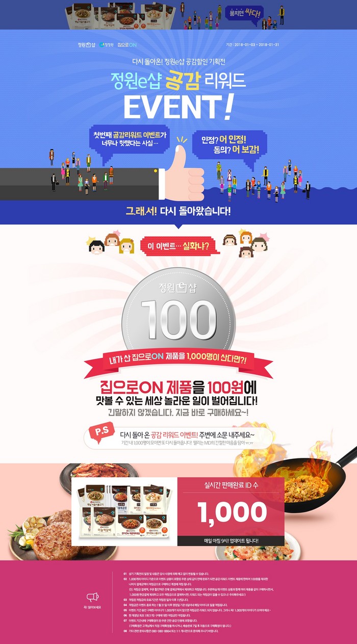 ‘공감 리워드’는 한 ID당 한 번의 구매만 이벤트에 적용되며, 실시간 판매완료 ID 수는 매일 아침 9시 정원e샵 이벤트 페이지에 업데이트된다. 판매완료 ID 수 1,000개를 달성하면 이벤트 상품에 한해 100원을 제외한 나머지 결제금액이 적립금으로 환급된다.