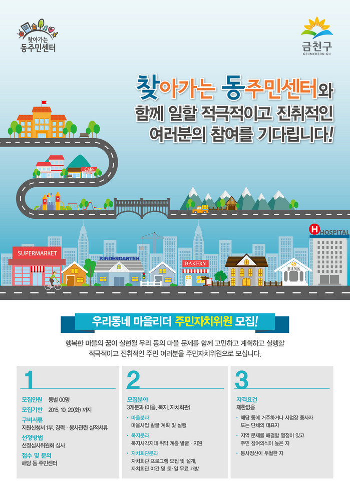 모집 기한은 10월 20일까지며 해당 동 관할구역에 거주하거나 사업장에 종사하는 사람으로 동네 발전을 위해 함께 일할 수 있는 주민은 누구나 참여할 수 있다.