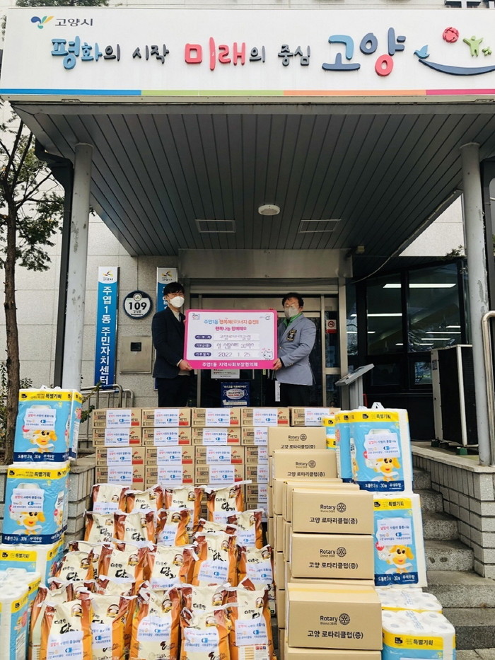 쌀, 화장지, 치약 등 다양한 생필품으로 구성된 후원물품은 총 600만원 상당으로, 고양로타리클럽과 고양상공회의소 사회공헌위원회가 함께 준비하여 주엽1동에 전달했다.