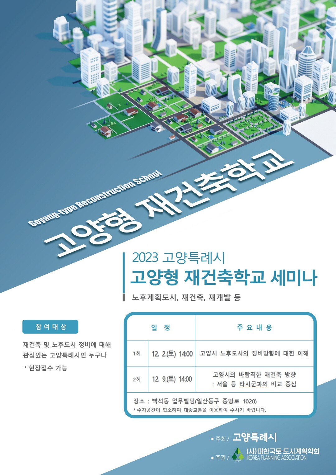 세미나는 오는 12월 2일, 9일 총 2회에 걸쳐 14시부터 16시까지 백석동 업무빌딩(백석동 중앙로 1020)에서 진행된다. 고양시 재건축 사업 및 정비방향에 관심이 있는 시민이라면 누구나 교육에 참석 할 수 있다.
