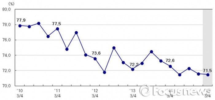 20일 통계청이 발표한 '3분기 가계동향'에 따르면 평균소비성향은 71.5%로 전년 동기 대비 1%포인트 하락했다. 이는 지난해 4분기에 기록한 역대 최저치와 같은 수치다.