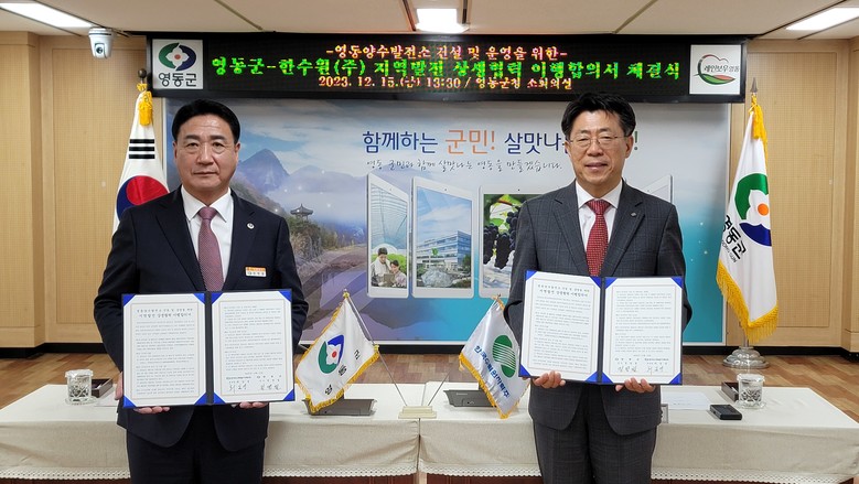 한국수력원자력(사장 황주호, 이하 한수원)이 15일 충북 영동군청에서 영동군과 ‘지역발전 상생협력 이행합의서’를 체결했다.