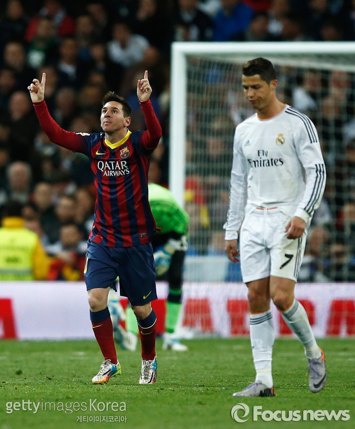 △ <마드리드/스페인=게티/포커스뉴스> 바르셀로나 리오넬 메시(왼쪽)가 2014년 3월24일 새벽(한국시간) 원정으로 열린 레알 마드리드와의 프리메라리가 경기에서 득점에 성공한 뒤 환호하고 있다. (C)게티이미지/멀티비츠