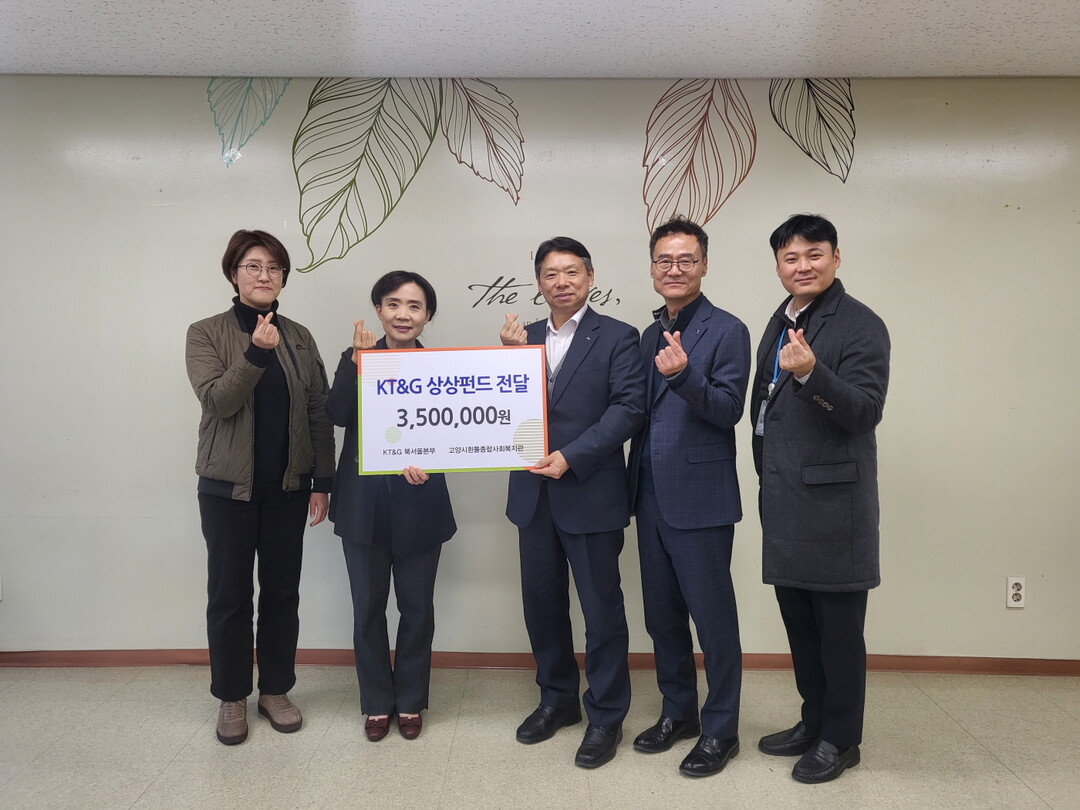 김해준 KT&G 북서울본부 고양지사장은 “어려움을 겪고 있는 지역 내 소외계층에게 이번 기금이 도움이 되길 희망한다. 앞으로 지역사회의 어려움에 관심을 가지고 나눔 활동에 적극 지원하겠다”라고 말했다.