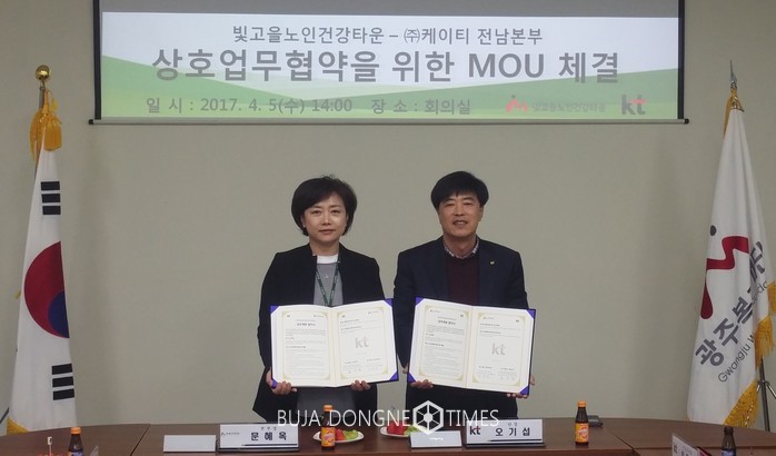 | △광주복지재단 빛고을노인건강타운은 KT전남본부 Biz법인단과 IT기기 활용 교육을 통한 세대간 정보격차 해소 위한 업무협약을 체결했다 |