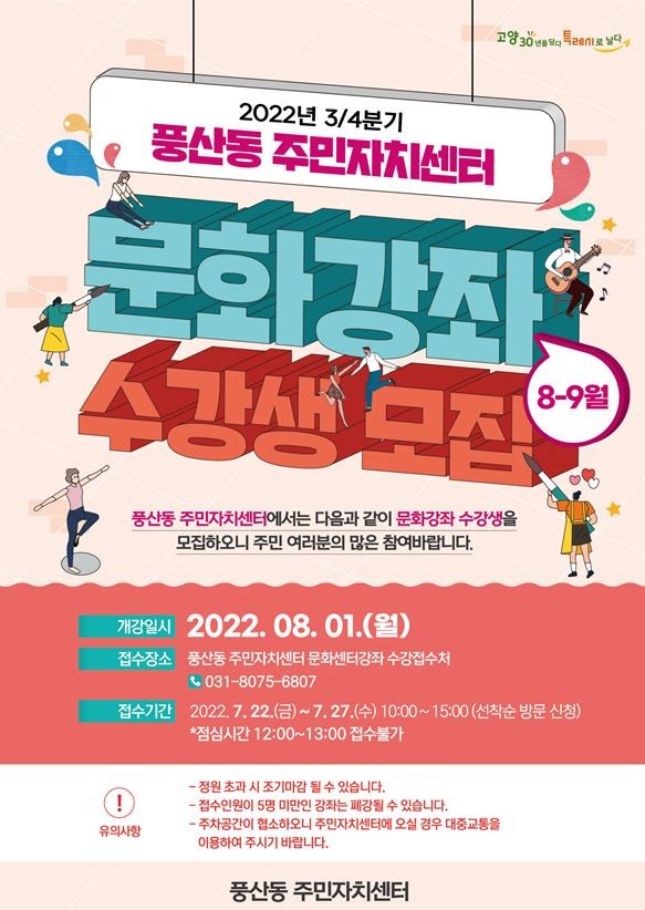 풍산동 주민자치센터 문화강좌 접수는 7월 22일부터 7월 27일까지 매일 오전 10시부터 오후 3시까지(12시~1시 제외) 풍산동 행정복지센터 1층 접수처에서 진행되며, 자세한 내용은 고양시청 홈페이지 내 풍산동 페이지에서 확인 가능하다.