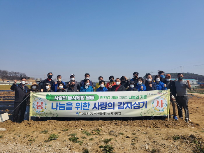 ‘사랑의 농사체험 활동’은 관내 텃밭에서 감자 등 농산물을 재배 및 수확하여 어려운 이웃에게 나누는 주민 자치사업으로, 지난 3월 26일 개최된 고봉동 주민총회에서 최종 의결된 사업이다. 심은 감자는 올해 6월 수확해 저소득층과 독거노인 등 관내 취약계층에게 기부할 예정이다.