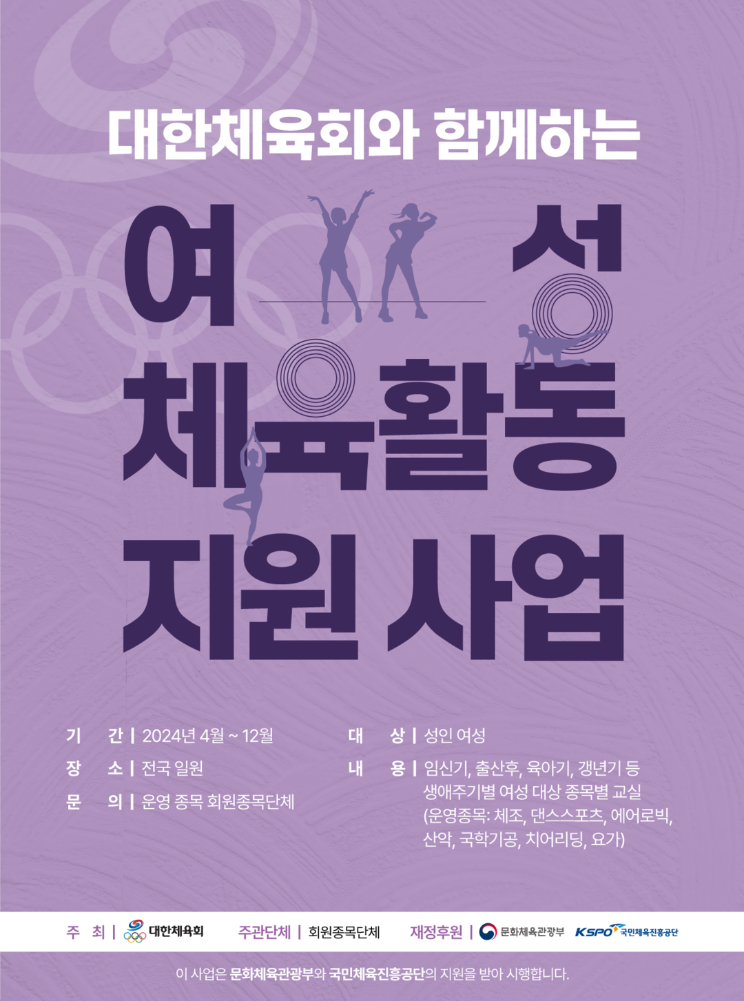 [부자동네타임즈 = 김인수 기자] 대한체육회(회장 이기흥)는 여성체육활동지원 사업의 일환으로 운영하고 있는 임신기·출산기·육아기·갱년기 등 여성 생애주기별 맞춤형 스포츠 교실의 2024년 참가자를 모집한다.