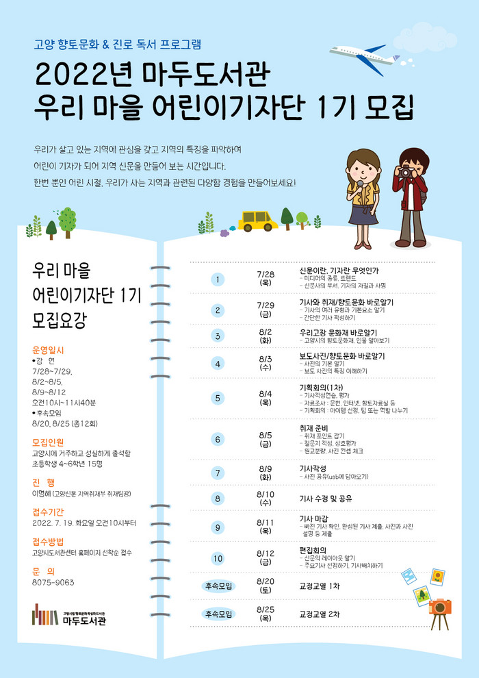 기자단은 19일 화요일 오전 10시부터 고양시도서관센터 홈페이지에서 선착순으로 모집한다. 기타 자세한 내용은 마두도서관으로 문의하면 된다.