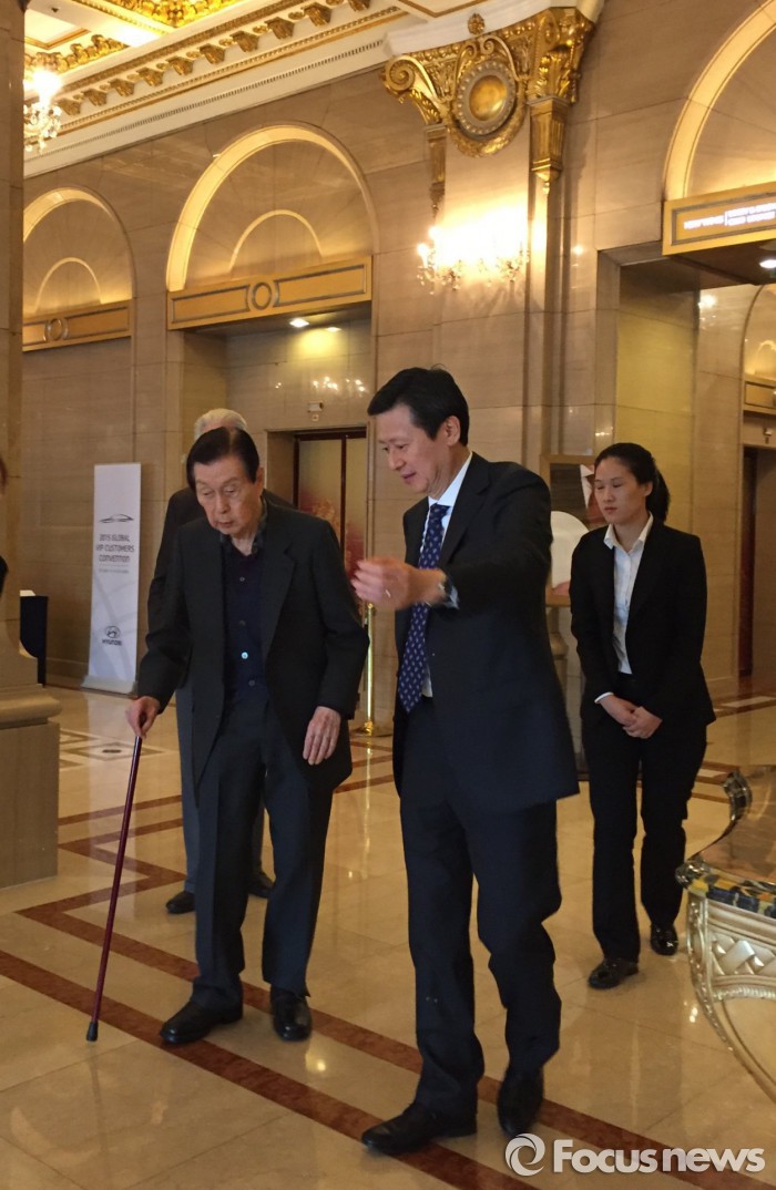 | △ 지난달 19일 오후1시30분 신격호 롯데 총괄회장이 장남인 신동주 전 일본롯데홀딩스 부회장과 소공동 롯데호텔 로비를 나서고 있다.<사진제공=SDJ코퍼레이션> |