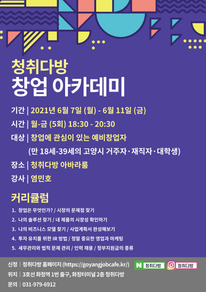청취다방 운영자는 “창업에 대한 기초지식부터 계획, 지원 제도 및 투자 유치까지 전반적인 과정을 배울 좋은 기회”라며 “창업에 관심이 있는 많은 청년이 참여하기를 바란다”고 말했다.