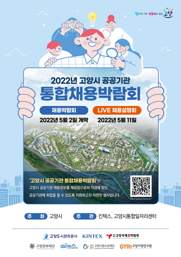[부자동네타임즈 김인수기자] 2022년 고양시 공공기관 통합채용박람회가 5월 2일(월)부터 5월 13일(금)까지 온라인으로 개최된다. 박람회는 고양시가 주최하고 킨텍스와 고양시통합일자리센터가 공동 주관하며, 고양시 산하 7개 공공기관인 고양도시관리공사, 킨텍스, 고양국제꽃박람회, 고양문화재단, 고양산업진흥원, 고양시청소년재단, 고양시정연구원이 참여한다.