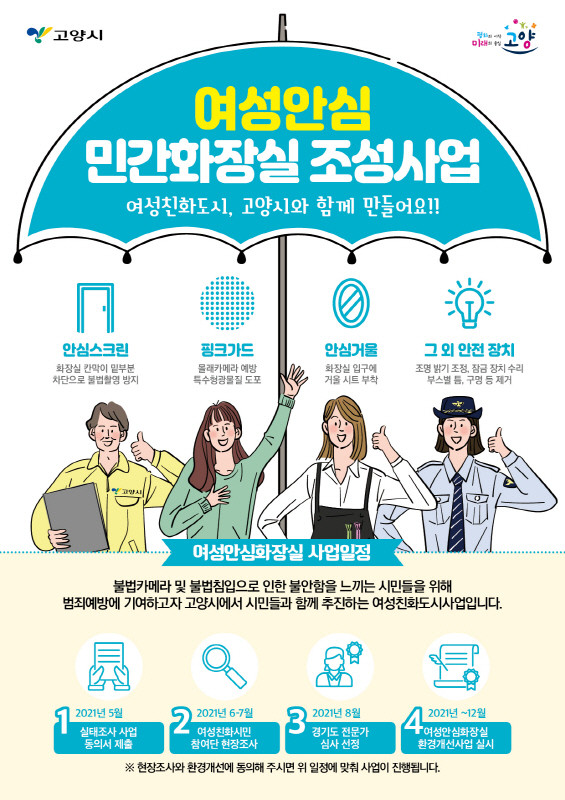 시는 여성친화도시 시민참여단, 경찰서, 상인연합회, 상가관리단 등과 함께 유동인구가 많고 범죄 사각지대에 놓이기 쉬운 화정로데오거리, 라페스타, 주엽역, 탄현역 일대의 민간화장실을 선정한다. 이후 동의 절차를 거쳐 6월 한 달 간 대상지 선정에 필요한 모니터링을 실시한다.