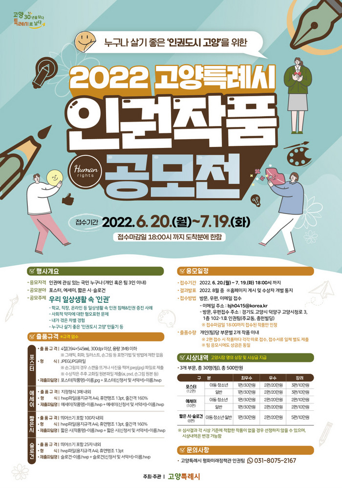 시는 전문가 심사를 통해 총 30팀을 선정, 총 500만원의 시상금과 상장을 수여할 계획이다. 수상 작품은 향후 고양시에서 개최하는 인권작품 전시회 및 인권 관련 행사와 교육, 인권 증진을 위한 다양한 홍보 활동 등에 활용될 예정이다.