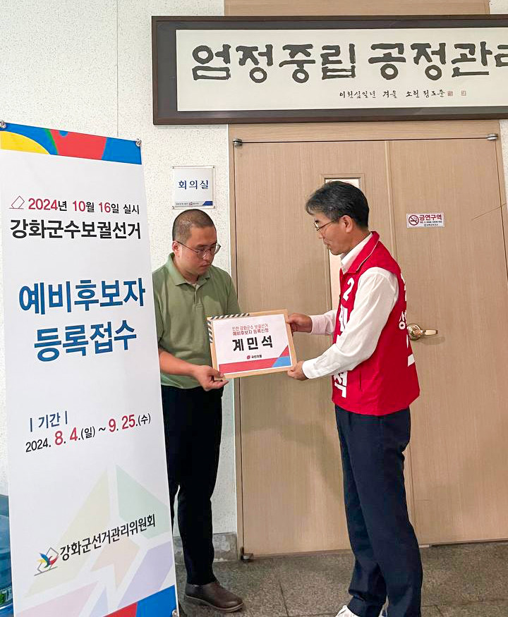 국민의힘 계민석 후보가 제79주년 광복절을 하루 앞둔 8월 14일, 강화군수 보궐선거 예비후보 등록을 하면서 오는 10월 16일 실시되는 인천 강화군수 보궐선거의 국민의힘 후보 자리를 놓고 후보들간의 본격적인 공천경쟁이 시작됐다.