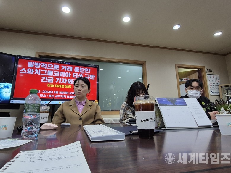 대리점주들은 11일 오후 용산 삼각지역 프라이블에서 기자회견을 열고 "한국 진출 초창기부터 티쏘의 브랜드 성장을 위해 10여년간 함께 노력해 온 파트너라고 자부했으나 스와치그룹코리아는 지난 2월 15일 대리점주들에게 계약해지를 요구했다"며 대리점주 생존을 위한 대화에 나서달라고 요청했다.