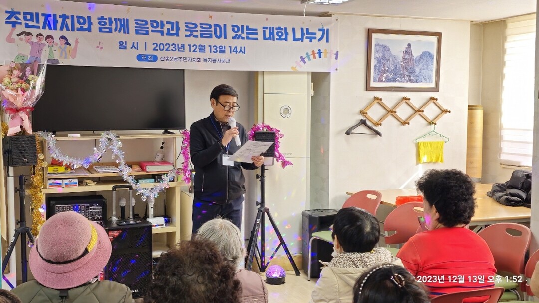 김연희 복지분과장은 “주민자치회와 함께 음악과 웃음이 있는 대화 나누기 행사에 참석해 주신 어르신들께 감사드리며, 어르신들이 살기 좋은 삼송2동을 조성하기 위하여 주민자치회 위원들과 최선을 다하겠다.”라고 말했다.