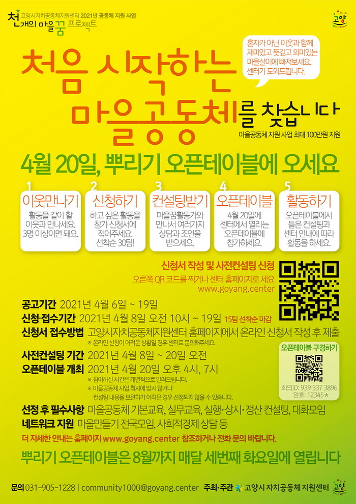 지원 사업을 희망하는 공동체는 오는 4월 6일에 고양시자치공동체지원센터 홈페이지에서 공고 내용을 확인할 수 있다. 자세한 문의는 고양시자치공동체지원센터로 하면 된다.