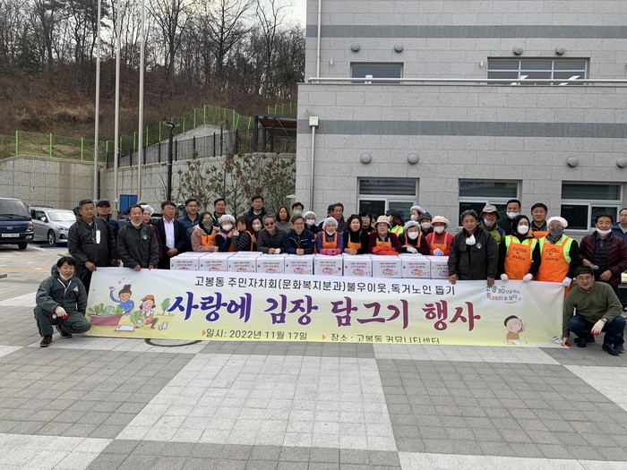 2022년 고봉동 주민자치회 자치사업 사랑의 농사체험 일환으로 진행 된 이번 김장 나눔 행사는 김장에 쓰일 배추와 무를 직접 심고 수확하여 고봉동 주민자치회 및 직능단체 50여 명이 참여해, 700포기의 김치를 담가 관내 취약계층 200여 가구에 전달했다.