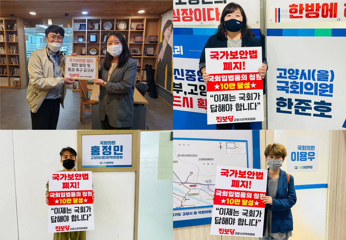 [부자동네타임즈 김인수기자] 진보당 고양시지역위원회(위원장 송영주)는 5월 27일 정의당 심상정(경기 고양시갑), 더불어민주당 한준호(경기 고양시을), 홍정민(경기 고양시병), 이용우(경기 고양시을)국회의원 지역구 사무실에 내방하여 국가보안법 폐지를 촉구하는 서한을 전달했다.
