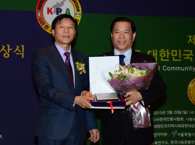 △ 박래학 서울시의회 의장(오른쪽)이 지역사회공헌 특별 대상을 수상하고 있다.