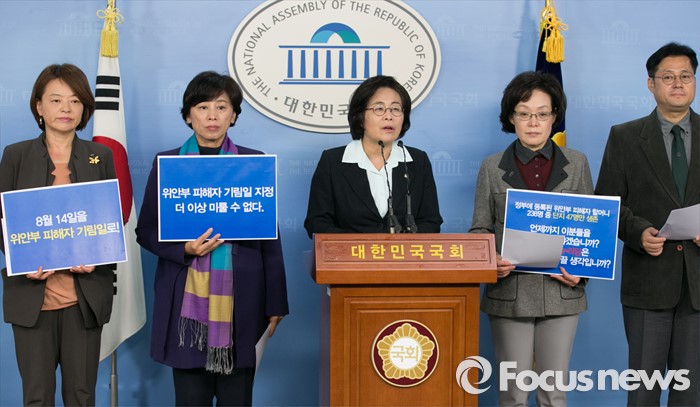 (서울=포커스뉴스) 17일 오후 서울 여의도 국회 정론관에서 여성가족위원회 소속 야당 의원들이 위안부 피해자 기림일 지정을 정부와 여당에 촉구하는 기자회견을 하고 있다. 왼쪽부터 진선미, 남인순 의원, 유승희 국회 여성가족위원장, 박혜자, 홍익표 의원.