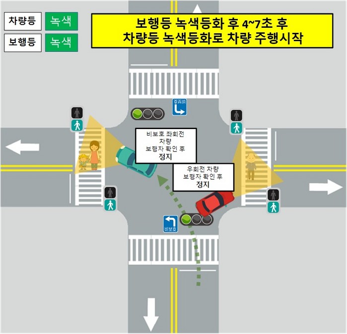 일반 교차로에서는 대부분 자동차 직진 신호와 보행자 횡단 신호가 함께 켜지지만, ‘보행자 우선 출발신호(LPI)’는 자동차 직진 신호보다 보행자 횡단 신호가 4~7초 먼저 켜지는 방식이다.