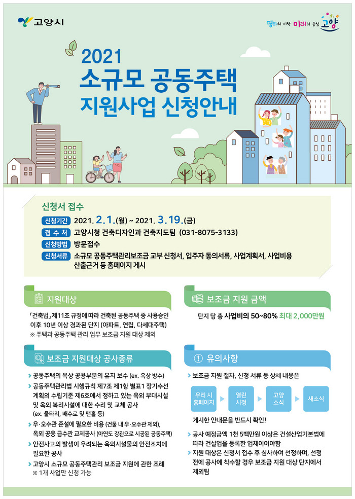 고양시 건축디자인과 관계자는 “코로나19 상황을 고려해 방문접수 외에도 비대면 우편접수도 진행하고 있으니 관심 있는 분들의 많은 신청 부탁드린다.”며, “이번 사업을 통해 소규모 공동주택 단지의 안전에 필요한 공사 및 노후 시설물 교체 공사 등을 지원해 공동체 삶의 터전을 보다 쾌적하고 안전하게 조성하기 위해 노력하겠다.”고 말했다.