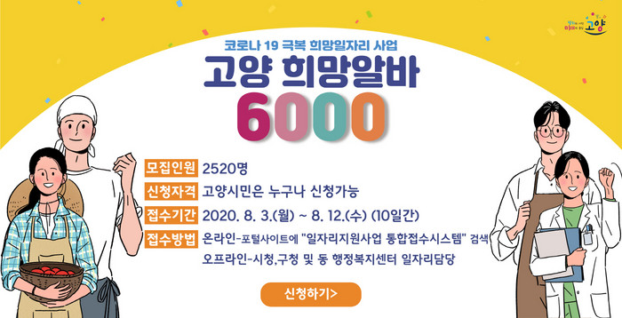 [부자동네타임즈 김인수기자] 고양시는 "코로나19 장기화로 인해 실직 등 경제적 어려움을 겪고 있는 취업취약계층이 최소한의 생활안정과 고용활동을 이어갈 수 있도록 단기 공공일자리를 제공하는 ‘고양 희망알바 6000’ 참여자를 오는 8월 3일부터 12일까지 10일간 모집한다"고 밝혔다.