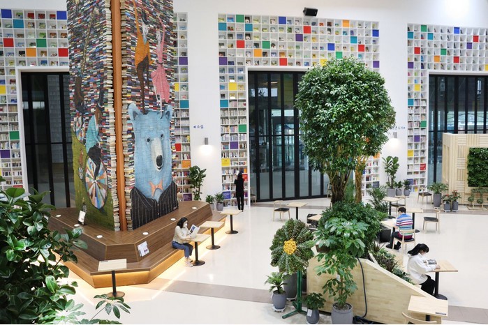 ㈜신세계프라퍼티에서 기증받은 9m 높이의 초대형 북트리 ‘원더랜드’도 만날 수 있다. 세계적인 북 아트 예술 작가인 ‘마이크 스틸키’(Mike Stilkey)의 작품으로, 버려진 책 1만 4천 권의 책을 쌓아 만든 북트리에 익살스러운 그림이 그려져 있다.