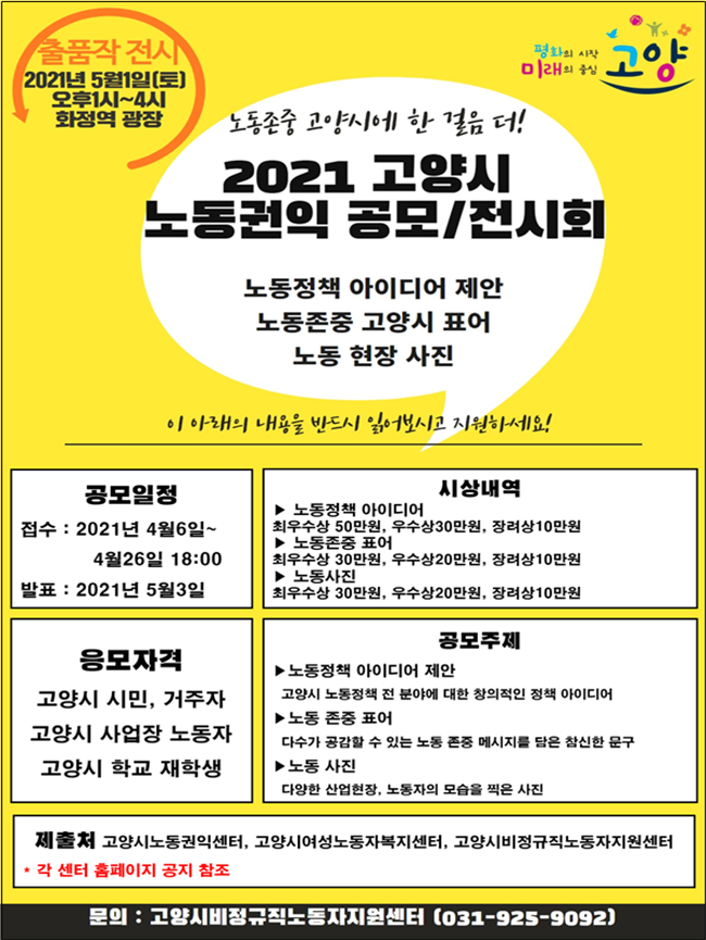 4월 6일(화)부터 4월 26일(월) 오후 6시까지 진행되는 ‘2021년 고양시 노동권익 공모전’은 고양시민, 고양시 사업장 노동자, 고양시 소재 학교 재학생으로 개인 또는 팀으로 참여할 수 있다.