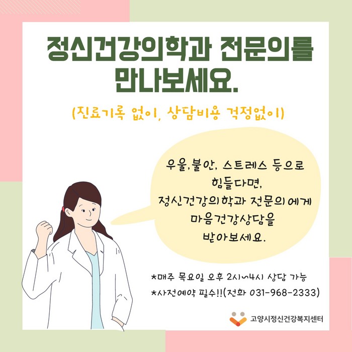 고양시정신건강복지센터가 운영하는 ‘정신건강의학과 전문의 상담’은 우울, 불안, 스트레스 등 정신건강 문제로 일상생활에 어려움을 겪고 있는 고양시민이라면 누구나 무료로 이용 가능하다.