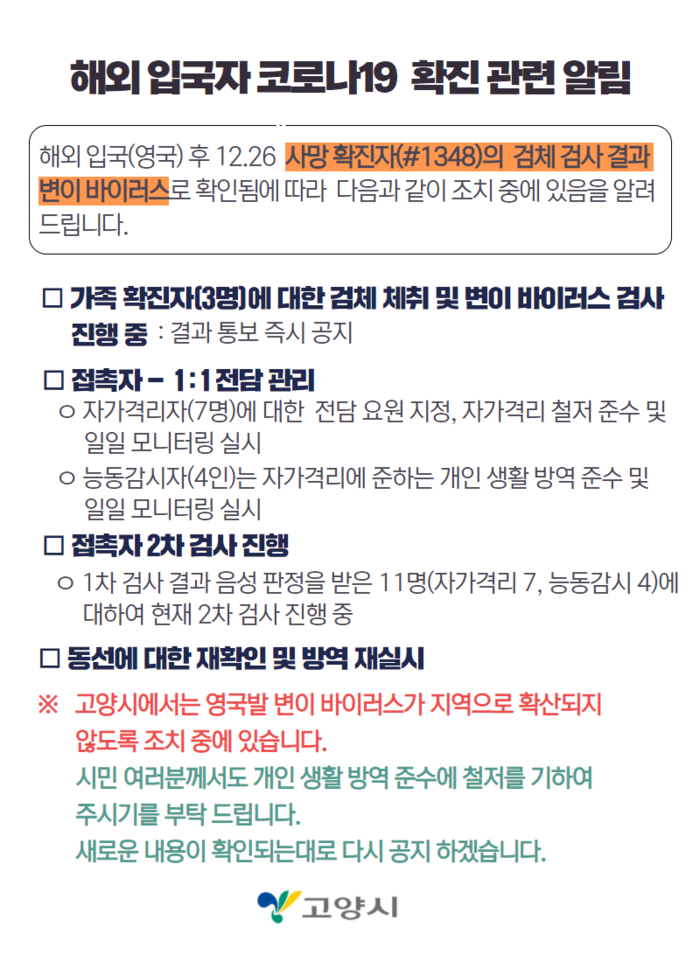 공개한 내용에는 사망 확진자의 경우, 12월 13일 영국에서 입국 후 자가격리 중 26일 자가격리 해제 전 코로나19 검사 위해 이동 중 자택복도에서 심정지 발생해 환자 부축 등 도움 준 주민 3명과 출동 구급대원 4명(방호복 착용)을 밀접접촉자로 분류, 코로나19 검사결과 음성판정 후 자가격리 중이다. 함께 입국한 두 가족은 12월 13일부터 자가격리로 동선이 없다.