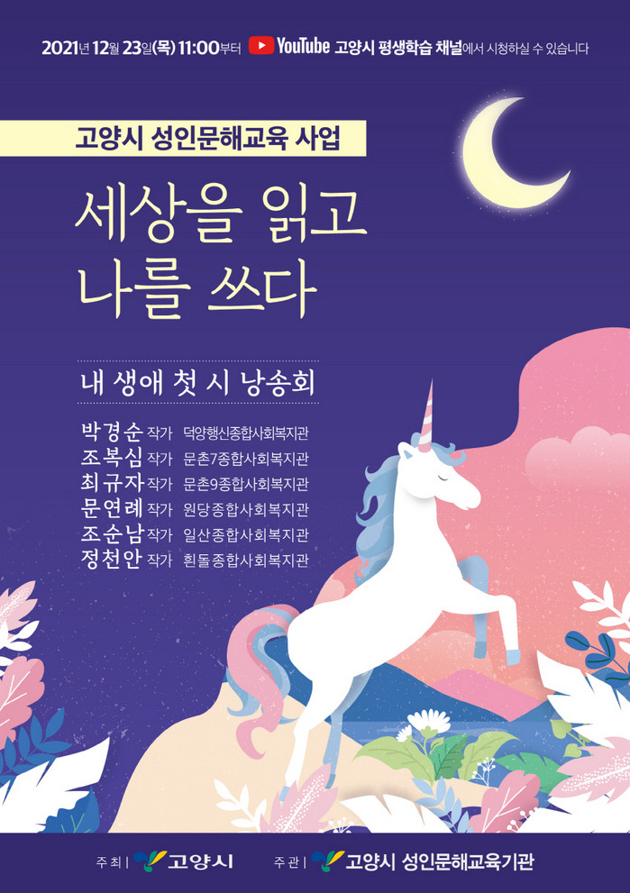 [부자동네타임즈 김인수기자] 고양시가 ‘2021년 고양시 성인문해교육 시 낭송회’를 23일 ‘고양시 평생학습 공식유튜브’를 통해 온라인으로 개최한다.