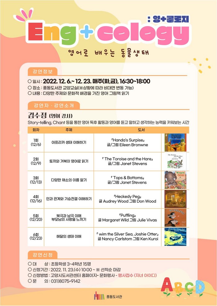 이번 프로그램은 풍동도서관 교양교실(상황에 따라 비대면으로 전환)에서 진행된다. 다양한 주제와 문화적 배경을 가진 영어 그림책을 읽고 영어 동요 등을 통한 독후 활동을 하며 영어로 듣고 말하고 생각하는 능력을 키워보는 시간이 될 예정이다.