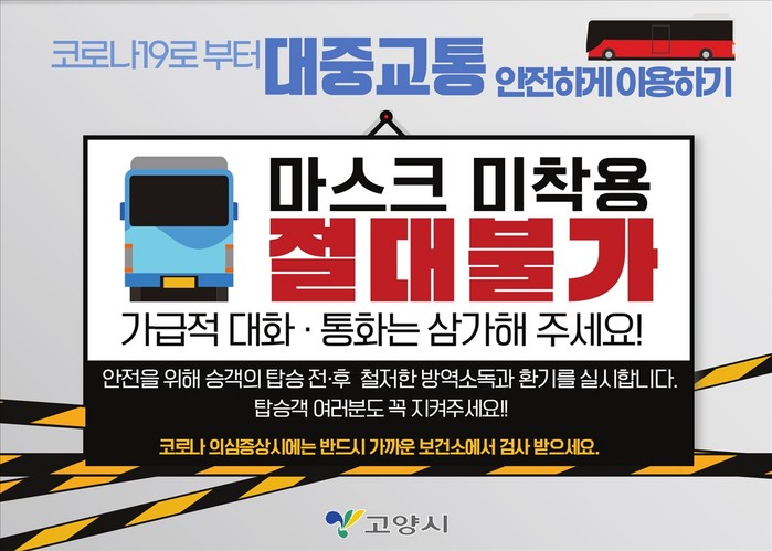 고양시 관계자는 “이번 홍보 스티커가 마스크 필수착용 등 대중교통 이용 에티켓이 정착되는데 도움이 되길 바란다. 대중교통 내에서 코로나19 예방수칙을 철저히 준수해 지역사회 확산을 막는데 시민 여러분들께서도 적극 협조해주시기 부탁드린다.”고 당부했다.