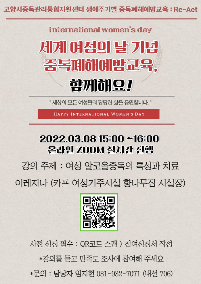 [부자동네타임즈 김인수기자] 고양시 중독관리통합지원센터(센터장 하종은)에서 세계여성의날을 맞이해 오는 8일(화) 여성 알코올 중독의 특성과 치료를 주제로 중독폐해예방 교육을 진행한다.