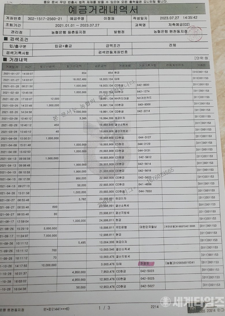 또 2021년 10월28일 대전의 이모 사업총괄본부장으로부터 금원 4989만 원을 비자금 계좌로 입금 받았으며, 2021년 11월24일엔 현금 5백만 원을 B씨 자신의 계죄명의로 이체한 후, 현금 638만 원을 2021년 112월 8일에 월남전참잔자회 중앙회 계좌에서 비자금 계좌로 입금했다며 비자금계좌 거래내역 일부를 증거로 제시 했다.