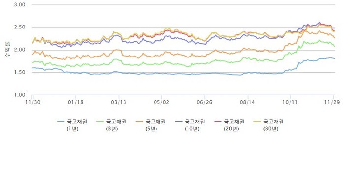 10년물과 50년물은 각각 0.3bp, 0.1bp 떨어졌지만 20년물은 0.2bp, 30년물은 0.7bp 올랐다.