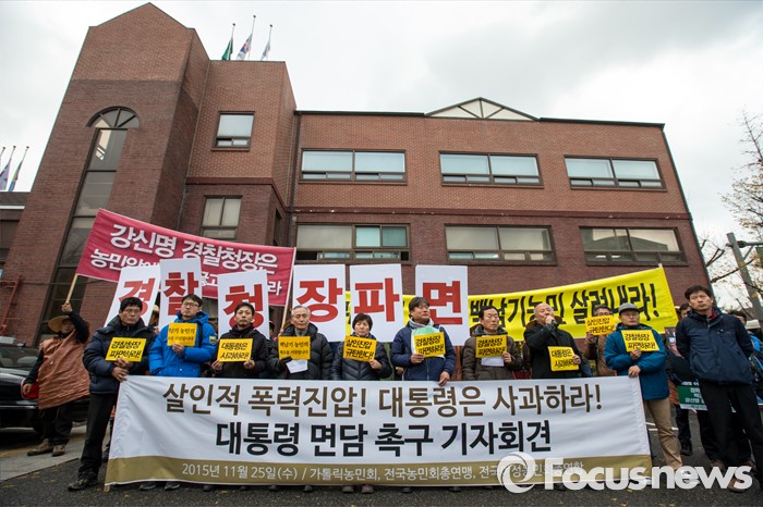 (서울=포커스뉴스) 25일 오후 서울 종로구 청운효자동 주민센터 앞에서 열린 '폭력진압 사과 촉구 대통령 면담 기자회견'에서 전국농민총연맹 관계자들이 경찰의 물대포 과잉진압에 대한 대통령 면담을 촉구 하고 있다.