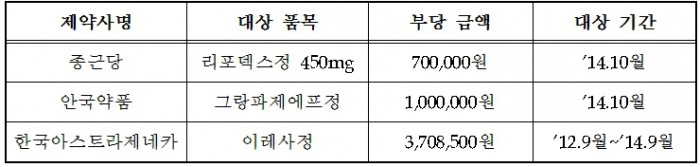 | △ 리베이트 대상 약제와 금액 <자료출처=보건복지부> |