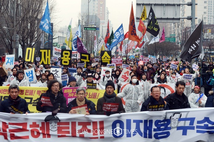 4일 오후 박근혜 대통령 퇴진 촉구 14차 촛불집회를 앞두고 서울 서초구 삼성전자 서초사옥 인근에서 박근혜대통령퇴진 비상국민행동(퇴진행동)을 비롯한 시민들이 박 대통령의 즉각 퇴진과 이재용 삼성전자 부회장의 구속을 촉구하며 행진하고 있다. 2017.02.04