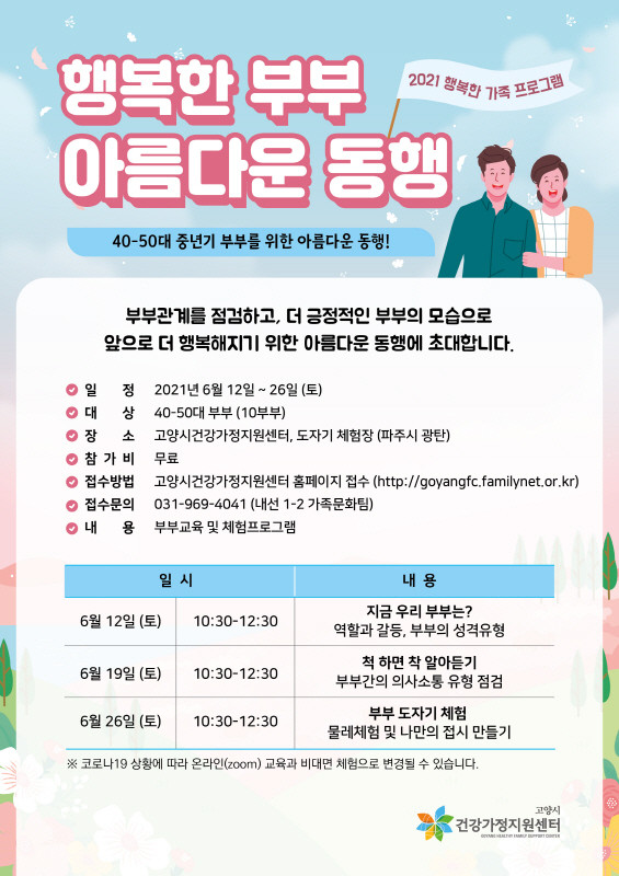 [부자동네타임즈 김인수기자] 고양시 건강가정지원센터에서는 6월 12일부터 26일까지 관내 거주하는 40~50대 중년기 부부 10쌍을 대상으로 ‘행복한 부부 아름다운 동행’ 가족 프로그램을 진행한다.