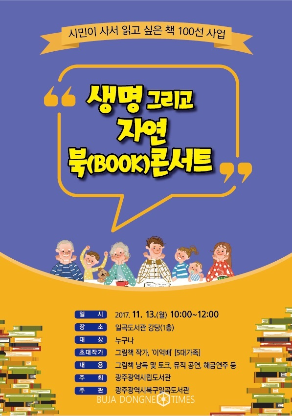북구는 오는 13일 오전 10시부터 일곡도서관 강당 1층에서 그림책 '5대 가족'의 저자 이억배 작가를 초청해 '책과 음악이 있는 북 콘서트'를 개최한다고 9일 밝혔다.